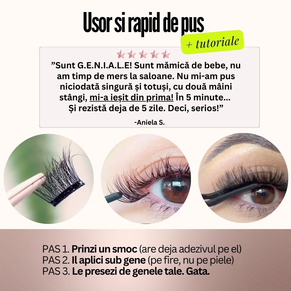 FĂRĂ LIPICI. REZISTĂ 5-10 ZILE. PRESEZI ȘI GATA. Vrei gene superbe și super ușor și rapid de aplicat?